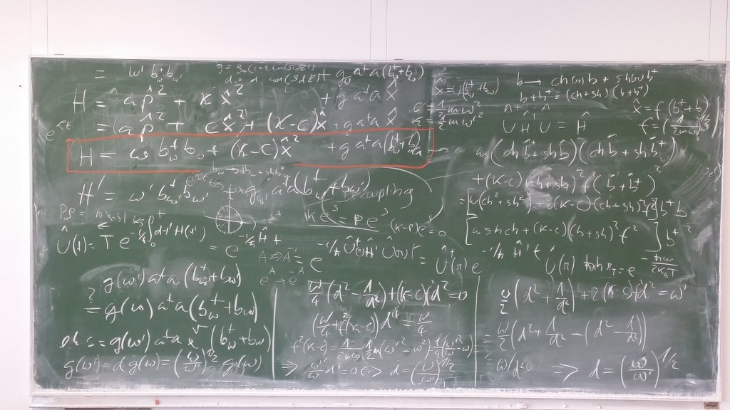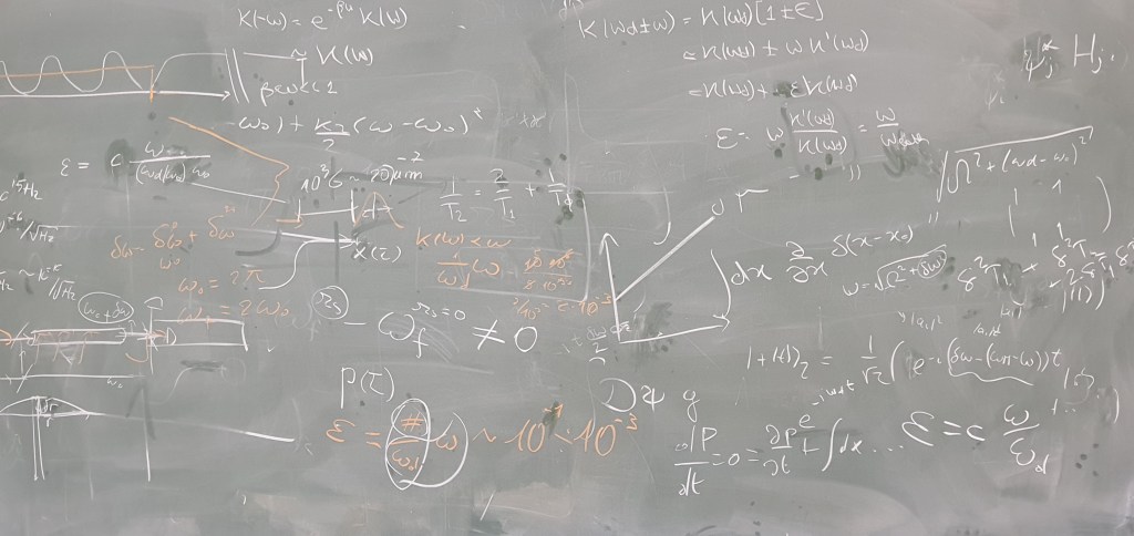This, I am afraid, only the initiated will know. Those who speak the language of signs and allusions to concepts that we physicists all learn during our studies. Signs and references loaded with centuries of cultural history. Just as artists keep copying and modifying, incorporating in a new canvas a clin d´oeil here and another tickle there for those literate in the history of art, we physicists speak a common language, the same everywhere on Earth. When we scribble things on the blackboard, we talk to each other, we bond and link. The process of creation is often shared between several or even many of us. We teach each other things on the blackboard, we learn from our colleagues. It is a give and take, and together we find new insights into how Nature works deep inside – or what we think we should do next to figure out how She works.